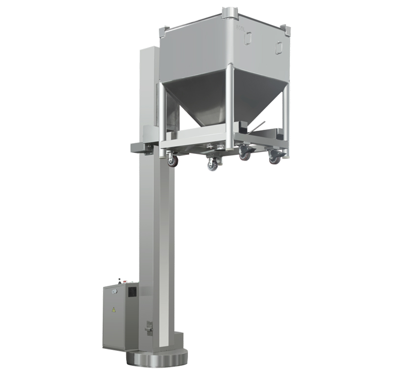 该机主要由底盘、立柱、提升系统等部件组成。工作时,先将装有物料的料斗推入料斗提升机的叉架上,然后启动提升按钮,料斗做提升运动,料斗到位后转动底盘与加料的设备密闭对接,开启出料蝶阀,使物料密闭转移到下一个工序。